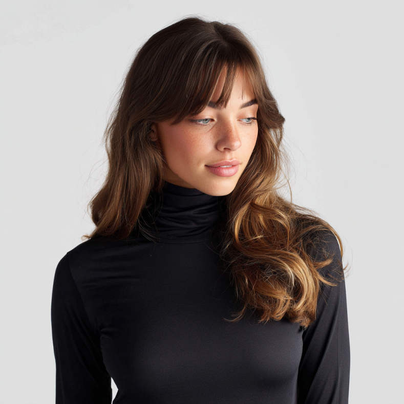 Stay warm and chic with this classic black long sleeve turtleneck from Move Theology. Designed with soft polyester fabric, this turtleneck offers a sleek and sophisticated silhouette that’s perfect for layering or wearing on its own. Whether you’re heading to the office or enjoying a cozy evening out, this wardrobe essential pairs effortlessly with jeans, skirts, or dress pants.